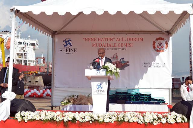 | Kıyı Emniyeti Genel Müdürlüğü'müzün yaptırdığı Türkiye'nin ilk acil müdahale gemisi “Nene Hatun”, Ulaştırma, Denizcilik ve Haberleşme Bakanımız Sn. Lütfi Elvan’ın katılımıyla denize indirildi. |
