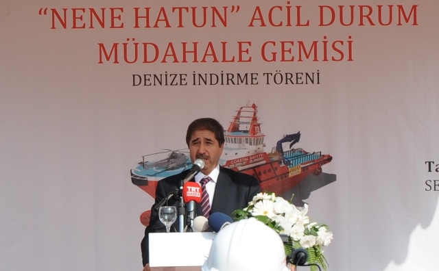 Törende konuşan Bakanımız Sn. Lütfi Elvan, Türkiye'de ilk kez imal edilen, Türk Acil Kurtarma gemisinin Türk denizciliğine önemli katkılar sunacağını söyleyerek seyir, can ve mal emniyetinin artırılması noktasında, her türlü hava şartında görev yapabilecek niteliklere sahip, gemi kazalarına, deniz kirliliğine ve yangınlara karşı operasyonel gücümüzü artıracak olan Acil Durum Müdahale Gemisi projesinde emeği geçen herkese teşekkür etti. |